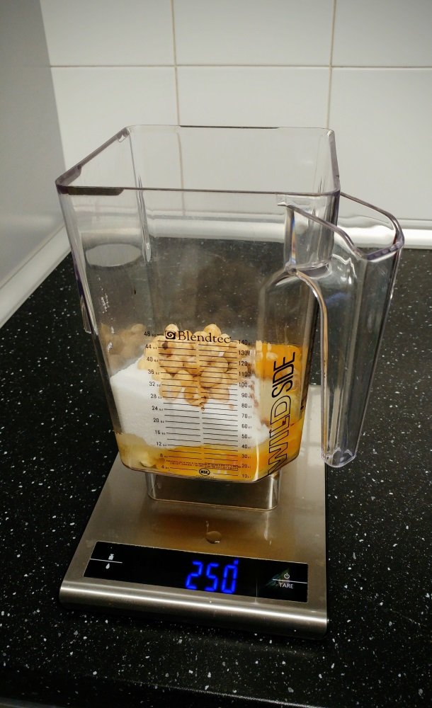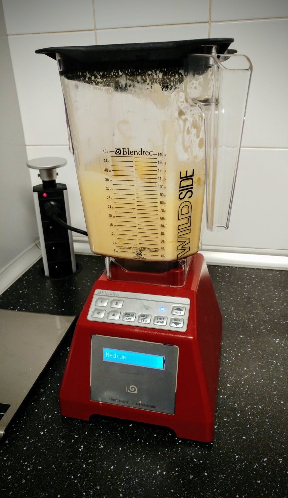 Versa tutti gli ingredienti nel bicchiere del frullatore (io uso il Blendtec) ad eccezione della farina e del lievito: seleziona multi-use e fai 3 cicli “slow” quindi, un paio di cicli con “medium”.