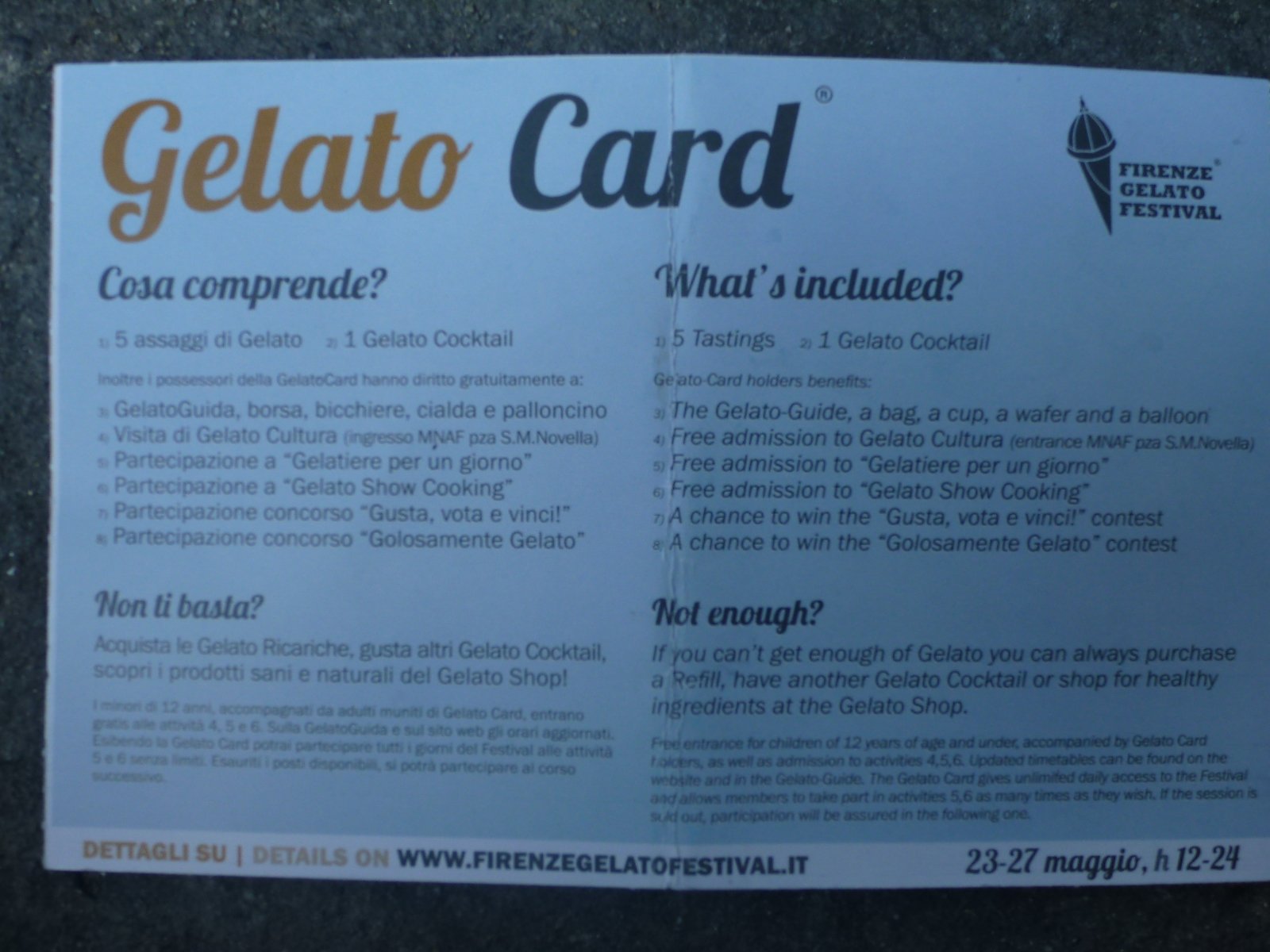 Sempre tante gelaterie di Firenze aderenti al “circuito” ma quest’anno senza ticket dell’autobus incluso, forse da fare completamente a piedi ma senza una piantina (non presente tra i tanti gadget inutili) con i punti geolocalizzati mi è sembrata più una “caccia alla gelateria”.