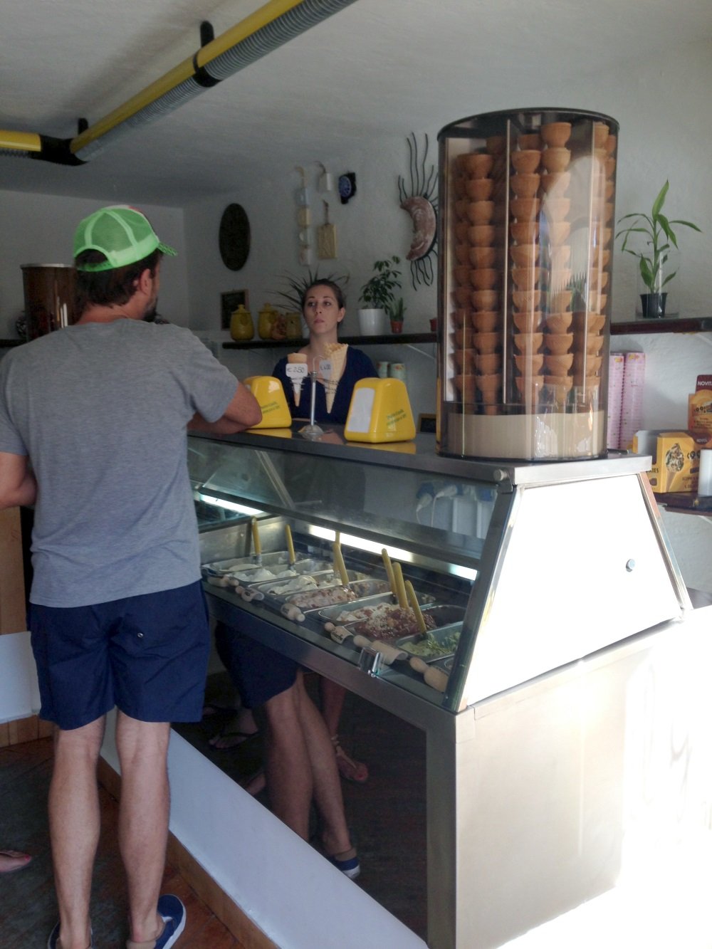 La vetrina dei sorbetti è quasi nascosta dal banco della cassa, le granite in bicchiere esposte sono “originali” visto che sono completamente ghiacciate e di difficile consumo anche con 30°C.