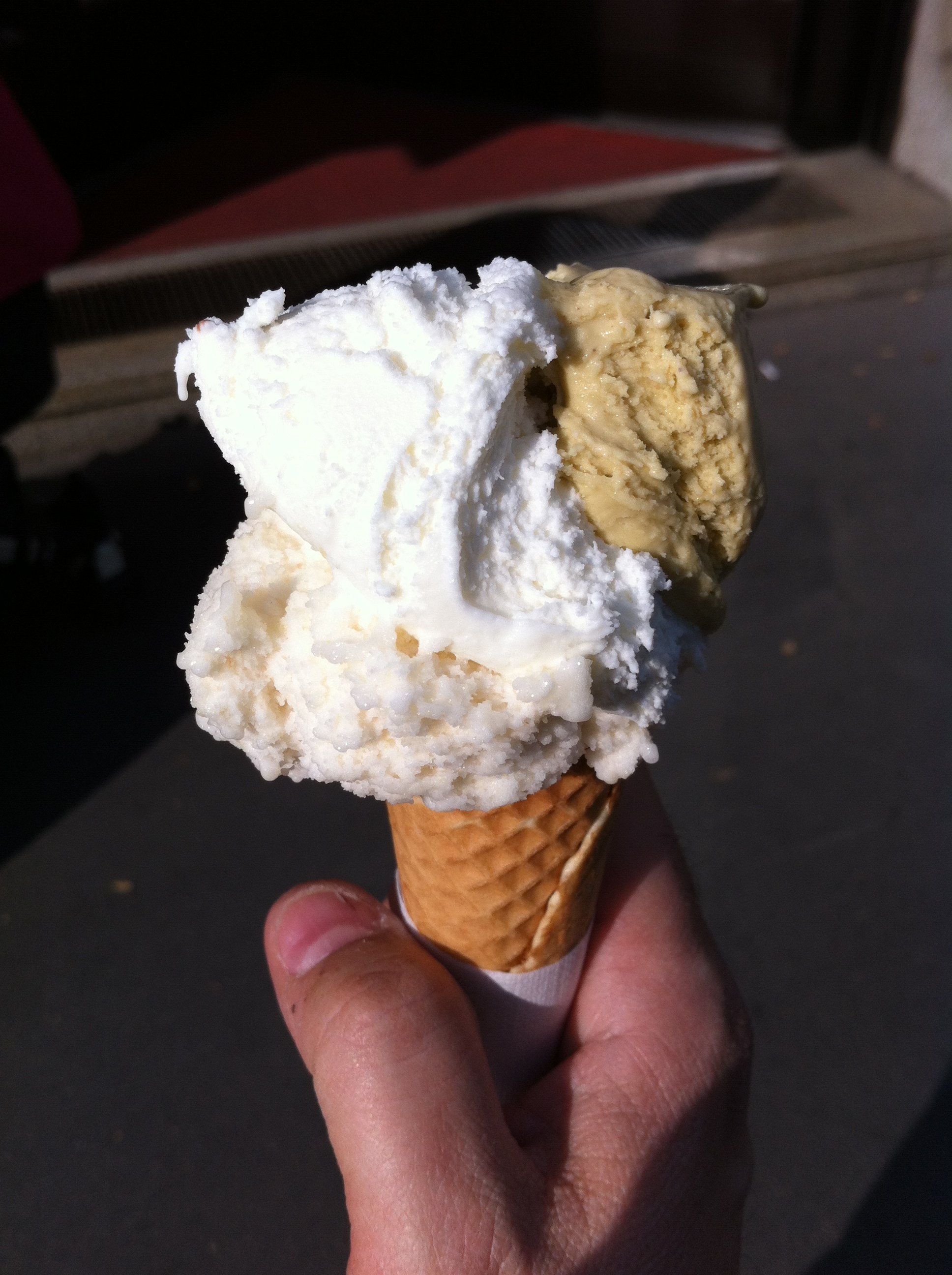 Un cono da 3 gusti, 3,00 EURO ma molto piccolo (ad esempio, rispetto a quello della gelateria K2). Cialda ottima.