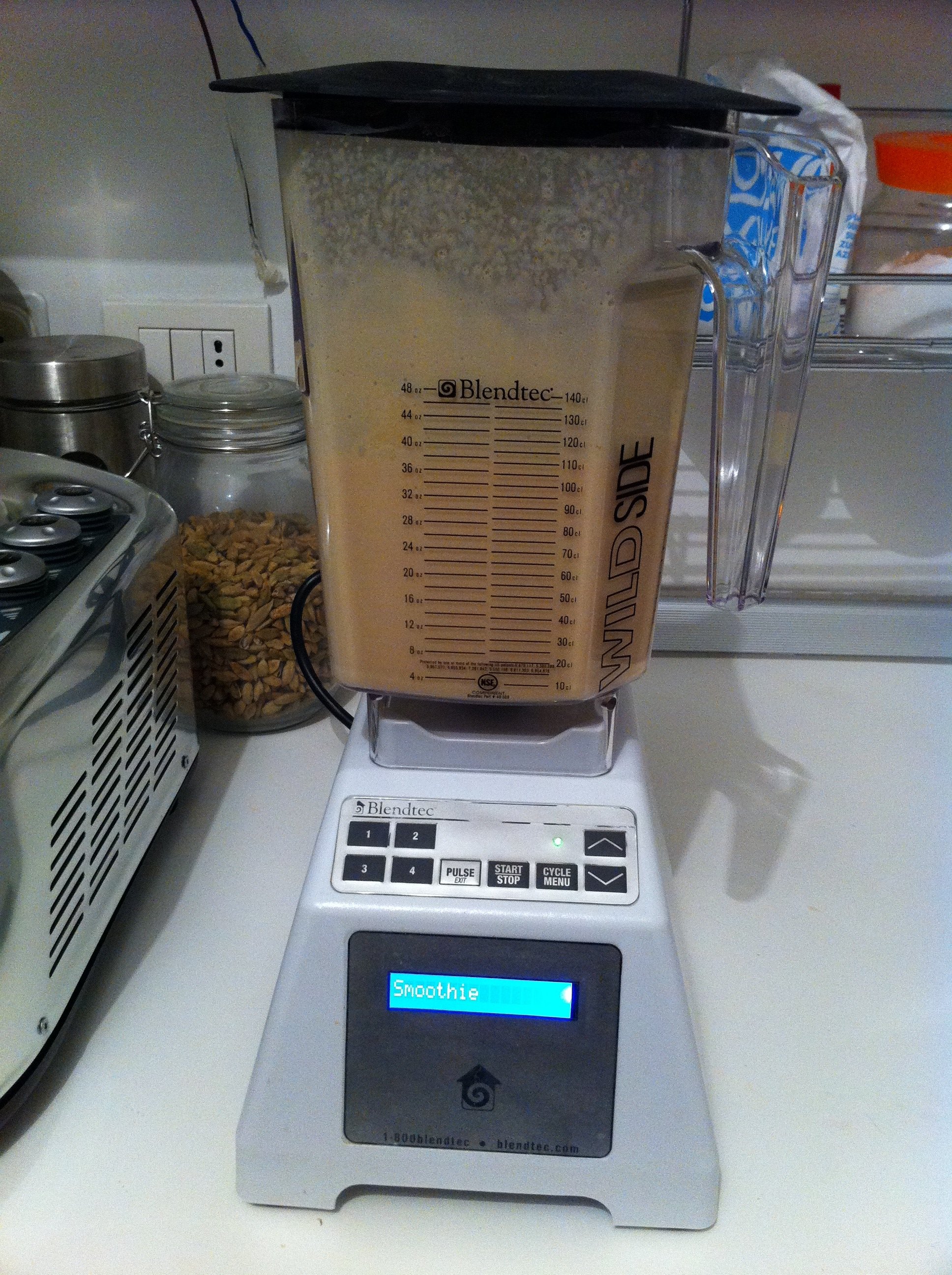 Con il frullatore Blendtec, ed il bicchiere wildside, seleziona “beverages” poi “smoothie” e fai 3 cicli: la miscela è pronta.