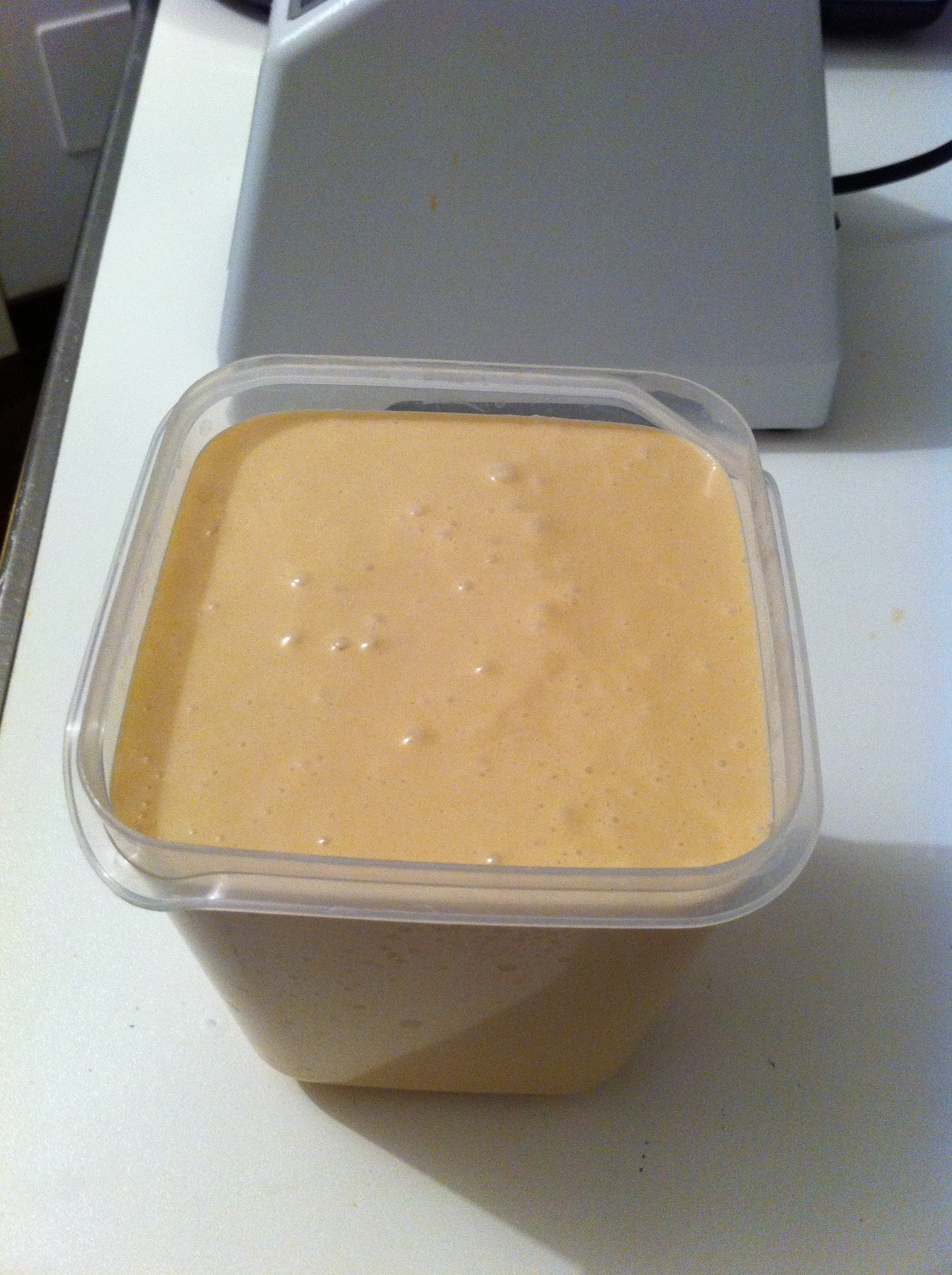 Versa nel contenitore in plastica alto e poni in congelatore per 4/5 ore, successivamente versa nella gelatiera per circa 30 minuti.