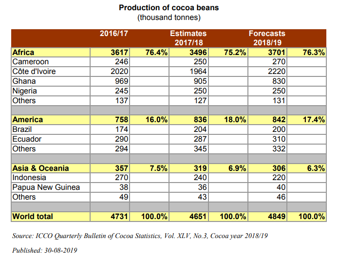 Quest’anno la produzione globale prevista di fave di cacao è circa 4.849.000 di tonnellate.