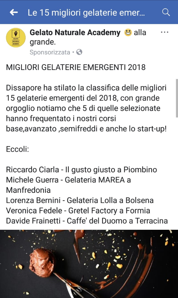 Ieri, invece, ho notato l’ultimo caso di celodurismo del settore, questa volta non più un gelatiere rivolto contro i suoi colleghi (un classico degli ultimi anni) ma di una scuola che si promuove (post sponsorizzato) utilizzando i corsisti “blasonati” anzi, le gelaterie selezionate nel solito articolo che parla di classifiche.