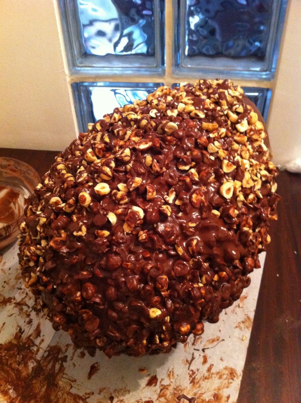 Per completare l’uovo di cioccolato gigante occorre tanta pazienza perchè le nocciole sul guscio attaccano bene quando il cioccolato fuso si raffedda solidificandosi.